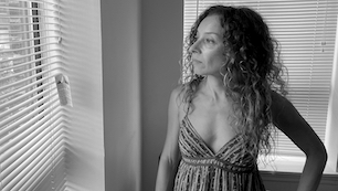 A catturare l’attenzione dell’osservatore, in un primo momento, è la figura al centro dell’immagine: una donna che sfoggia un costume intero rosa antico e un vistoso tatuaggio sulla schiena. M